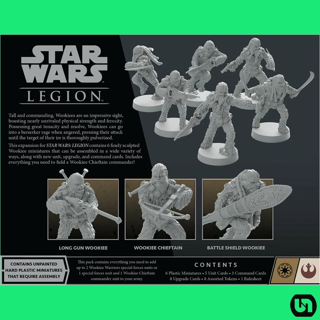 Additionally, a miniature representing a Wookiee Chieftain can enter the fight as a Republic commander and a fifth unit card and three command cards let them further influence your strategy. Finally, eight upgrade cards invite you to customize your units with Wookiees carrying an array of weaponry.