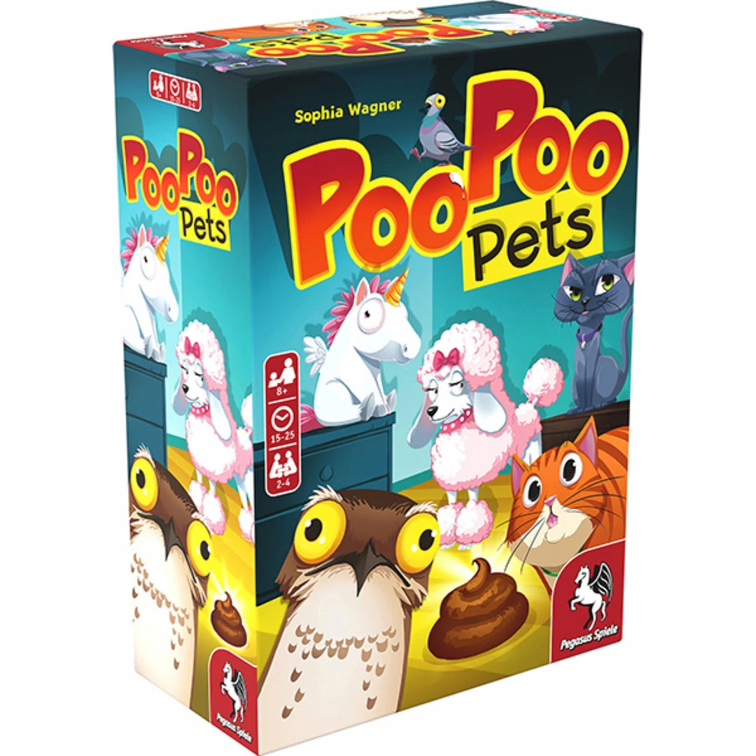 In Poo Poo Pets, all players roll their dice at the same time, trying to roll the number combinations shown on the other players’ tiles. As soon as a player does this, they quickly squeeze the squeaky poo pile. All players must pause to see whether the combination is correct, and if it is, the player may take the tile. As soon as a player runs out of tiles, they’re eliminated from the game.