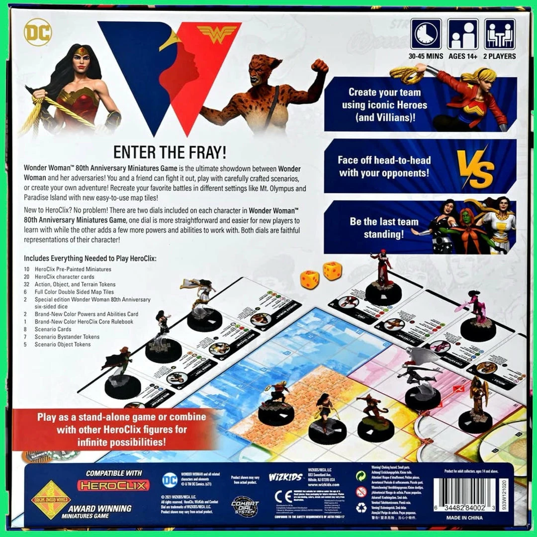 This boxed-set is a great way for 2 players to learn HeroClix! Existing players will definitely want to pick up this product since it includes tournament-worthy figures as well as an updated Rulebook and Powers and Abilities Card available for the first time ever!Wonder Woman is the Champion of Themyscira, one of the strongest people on Earth, hero to all Amazons, and a connection between Gods and mortals. What perils will face her on the HeroClix tabletop?!